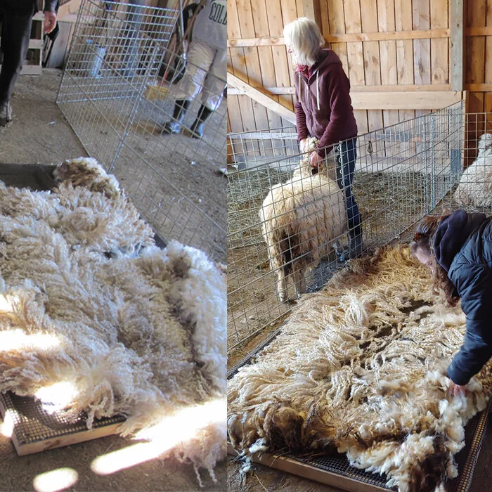 The fleece of the Leicester Longwool is prized by hand spinners and crafters for its curl, soft handle, and lustrous beauty. The fleece generally weighs from 11-18 pounds, although heavier fleeces have been recorded. The wool has an evenness of length with a spiral tipped staple length of up to 14 inches in twelve months growth. The wool dyes exceptionally well, maintaining the purity of color; the natural luster still shines through. This premium wool is very versatile, working well for combing for worsted products, carding for woolen products, and felting projects. The Leicester can be shorn twice per year. The Leicester Longwool is a medium to large polled breed with a high quality carcass, whose poll is well covered with locks of wool. Mature rams weigh 200-300 pounds and ewes weigh 150-200 pounds. The breed is white and natural in color.
